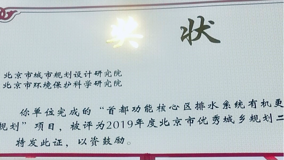 大西洋国际娱乐 水所参与完成的“首都功能核心区排水系统有机更新专项规划”项目荣获2019年度北京市优秀城乡规划二等奖